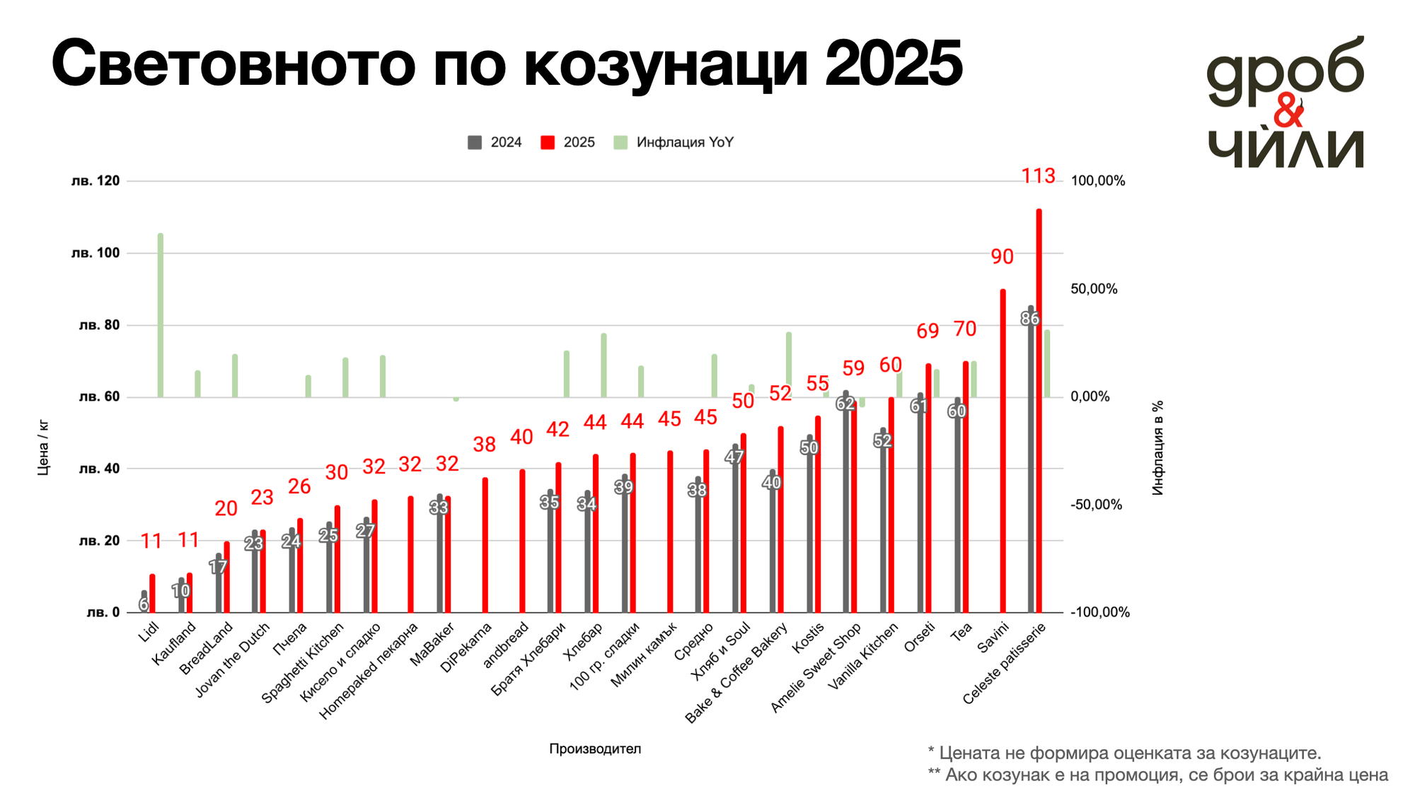 Докато държавата стартира доброволна инициатива "Великденска кошница" (кой ги измисля тея; "коректна фирма" за козунаци), реалните цени на козунаци, които събираме всяка година за Световното по козунаци на "Дроб & чили" изглеждат така: