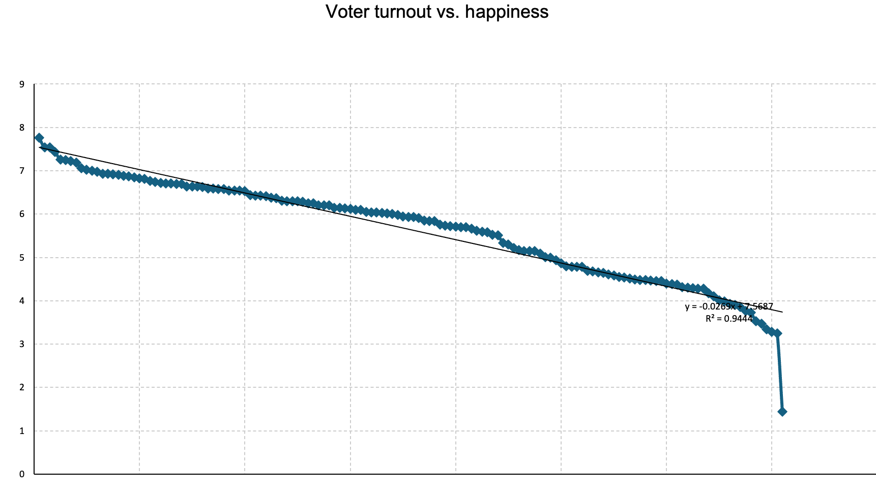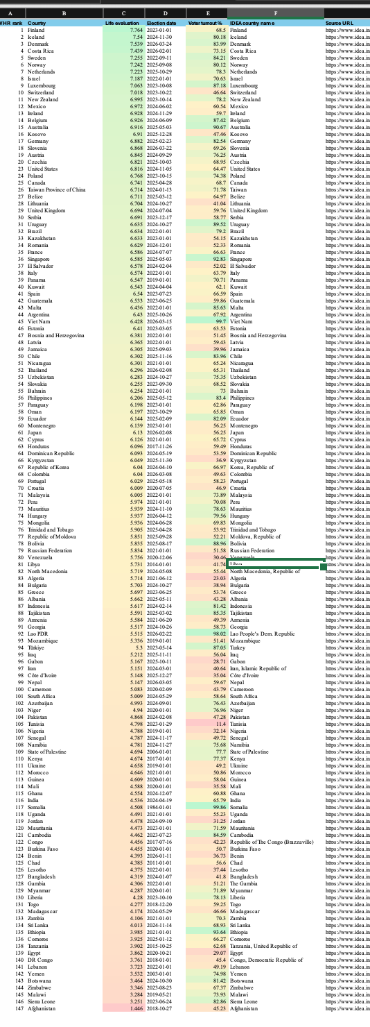 Получих brain fart да анализирам корелацията между (честна) избирателна активност и щастие на нациите. Т.е. дали ако повече хора гласуват, хората в държавата са по-щастливи.